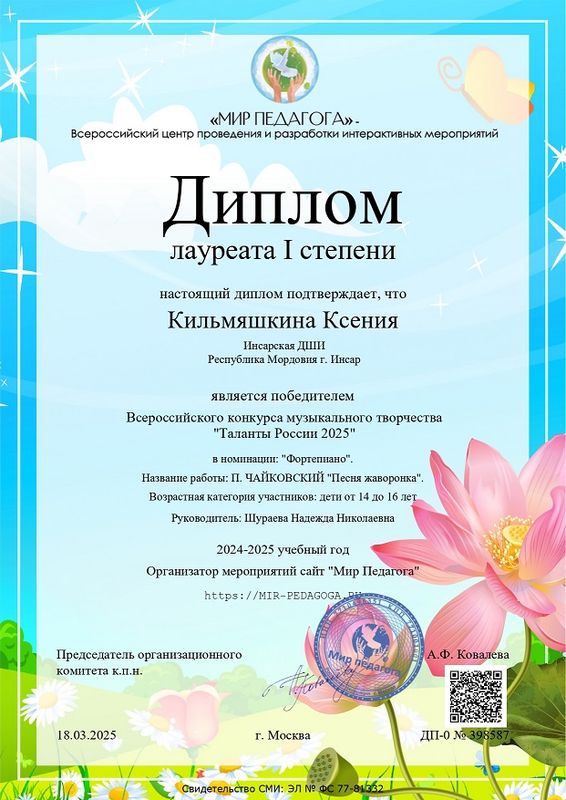 Поздравляем Кильмяшкину Ксению и Шураеву Надежду Николаевну с добавлением ещё одного пункта в их копилку достижений. Желаем Ксюше и её преподавателю, Надежде Николаевне, ещё много возможностей проявить себя, чтобы ещё не раз принимать участие в конкурсах различного уровня, показывать свой талант, способности и возможности. Главное – вера в силы, целеустремленность и трудолюбие.