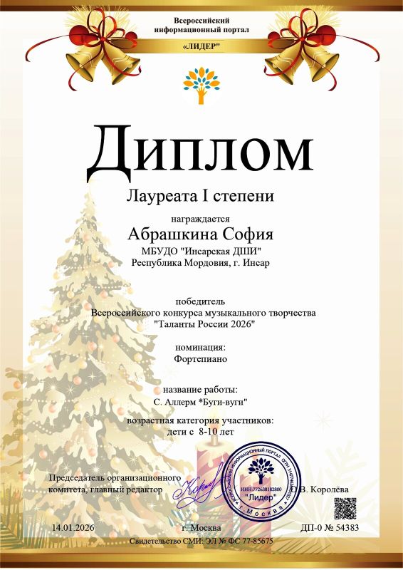 Поздравляем Абрашкину Софию с отличными результатом и победой во Всероссийском конкурсе музыкального творчества «Таланты России 2026».