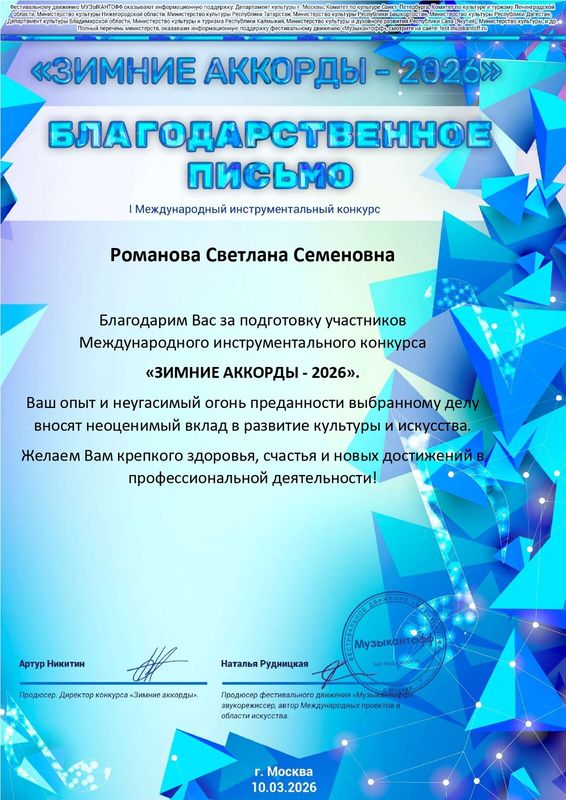 Ансамбль «Волшебный смычок» Инсарской детской школы искусств в составе: Акимовой Елизаветы, Кочеткова Александра, Ереминой Варвары, принял участие в I Международном инструментальном конкурсе «Зимние аккорды» и стал Дипломантом I степени.