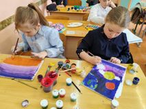 Перед рисованием космоса, преподаватель живописного отделения - Попова Светлана Викторовна провела тематический урок в 3 «Б» классе ИСОШ №2, познакомила детей с интересными фактами о космосе , рассказала, что такое галактика и какие планеты существуют в солнечной системе. После информационной части, дети окунулись в творческий процесс, создавая рисунки акварельными красками, где изобразили галактику и планеты Земля, Венера и Марс, путешествие в космос. Все дети остались довольны своими работами.