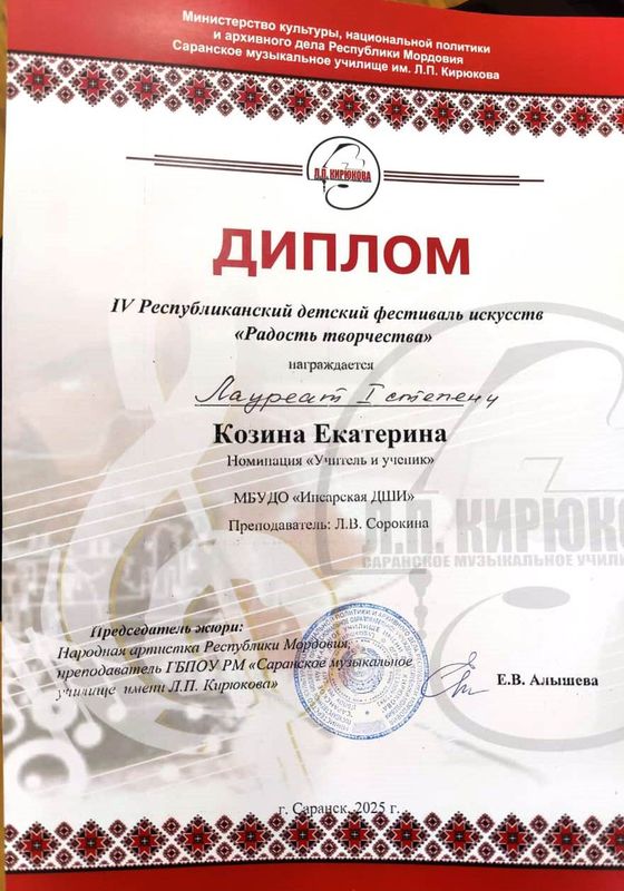 13 и 14 ноября 2025 года, на базе Саранского музыкального училища им. Л.П. Кирюкова, прошел IV Республиканский детский фестиваль искусств «Радость творчества». Этот фестиваль является творческим соревнованием, призванным продемонстрировать уровень владения знаниями, умениями и навыками, полученными в процессе обучения в детских школах искусств.