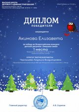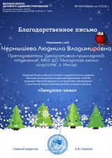 Ученица 3 класса декоративно-прикладного отделения Елизавета Акимова приняла участие во Всероссийском конкурсе детских рисунков «Зимушка-зима» и заняла почетное 1 место. А её преподавателя Людмилу Владимировну Чернышёву, отметили Благодарственным письмом. Поздравляем с победой!