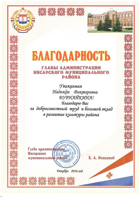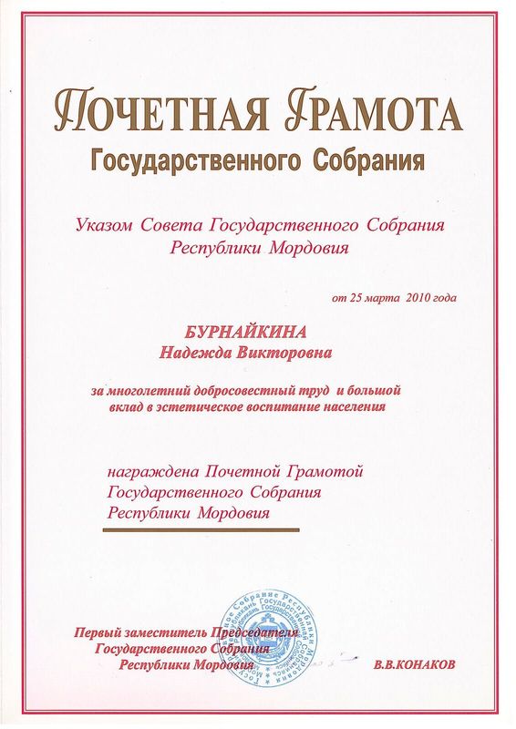Высшее образование.Рязанский филиал Московского ордена Трудового Красного Знамени государственного института культуры. Специальность - культурно - просветительская работа, квалификация: культпросветработник, организатор - методист культурно - просветительской работы.1987 г. Среднее - специальное образование. Саранское государственное музыкальное училище им. Л.П. Кирюкова. Специальность - народные инструменты (баян), квалификация: преподаватель ДМШ и руководитель самодеятельного оркестра народных инструментов. 1981 г. |
