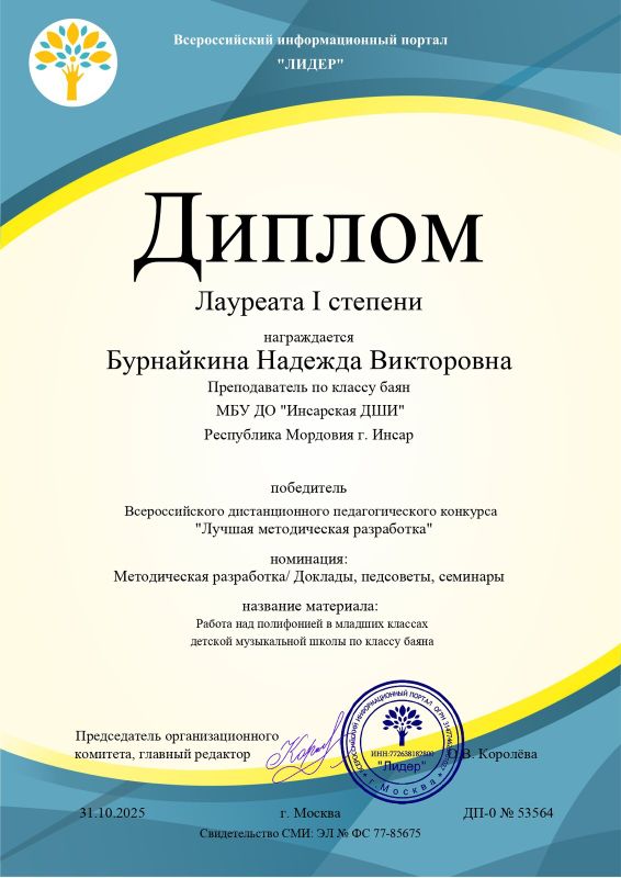 | Преподаваемые учебные предметы, курсы, дисциплины (модули) | Баян; Музыкальная литература; Слушание музыки |