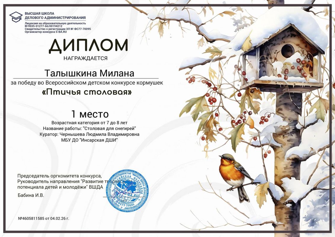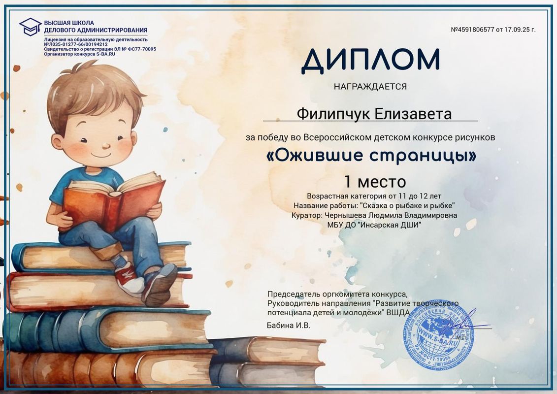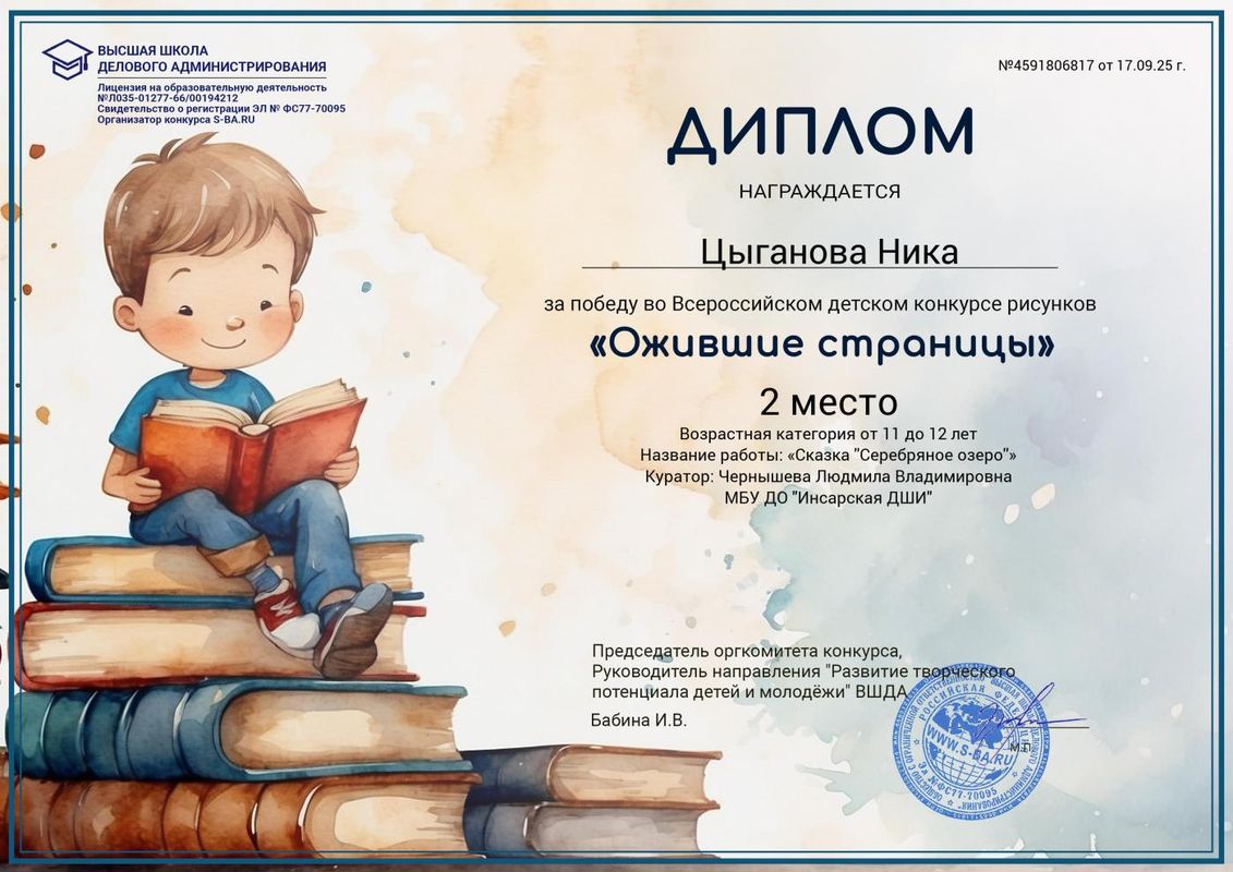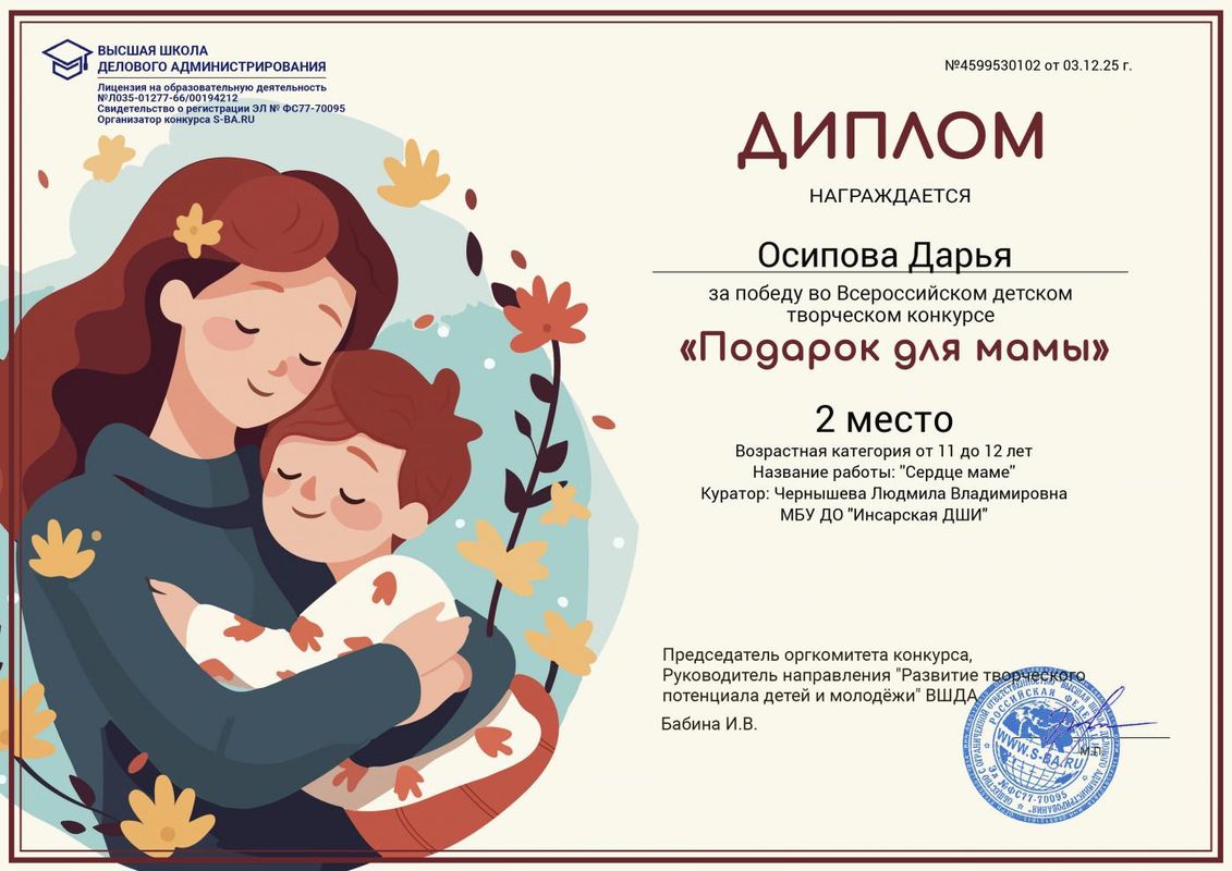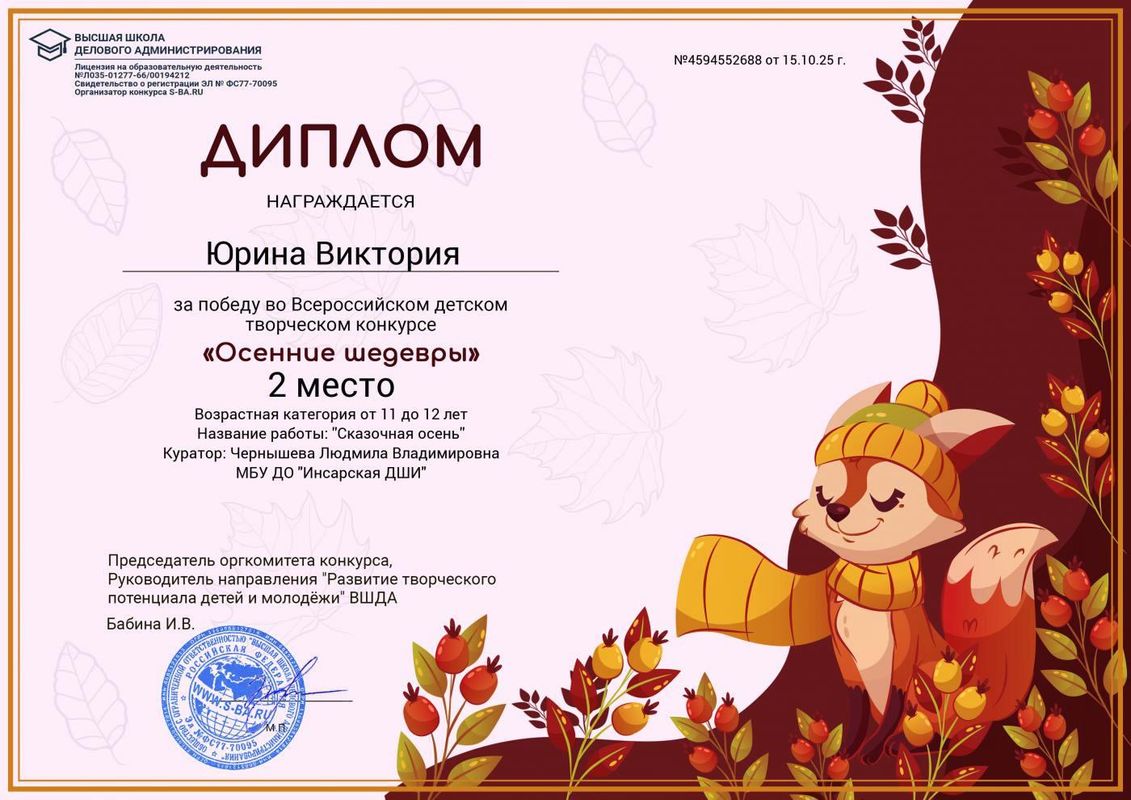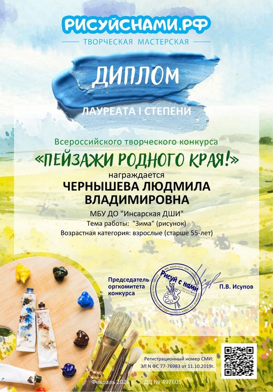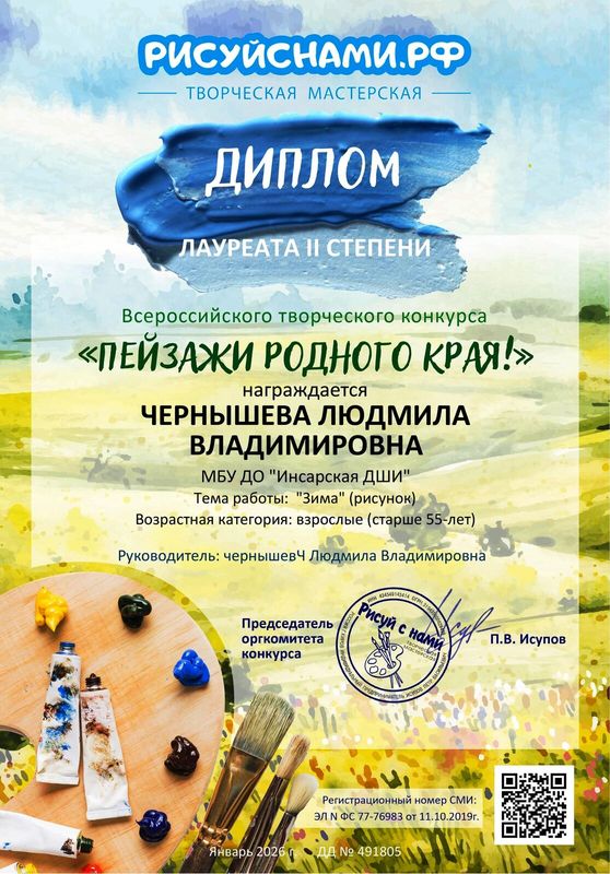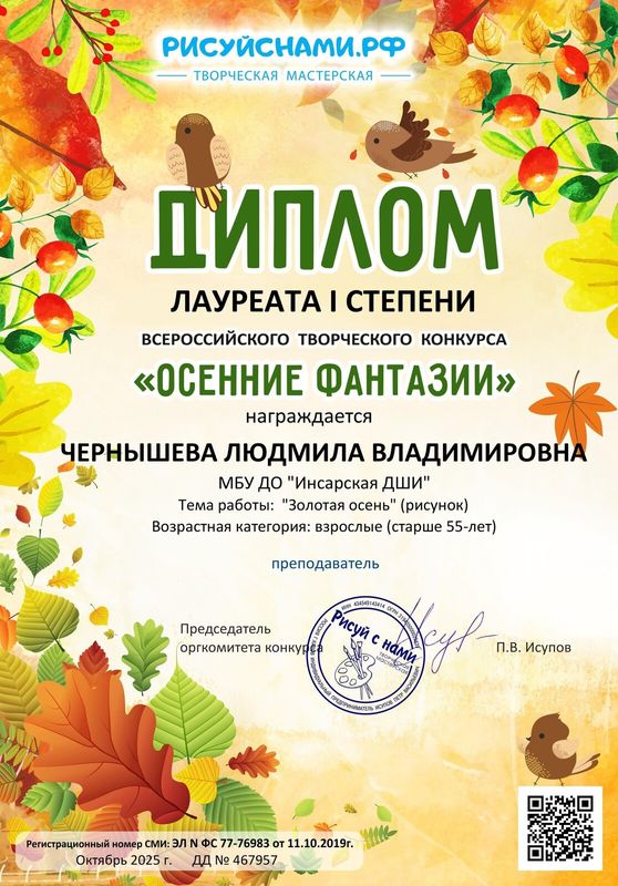 | Сведения о повышении квалификации (за последние 3 года) | Удостоверение о повышении квалификации 0000147 рег. номер 146 от 11.06.2025 г. по дополнительной профессиональной программе "Практики и методики преподавания в области изобразительного и декоративно - прикладного искусства" в объёме 72 часа. |