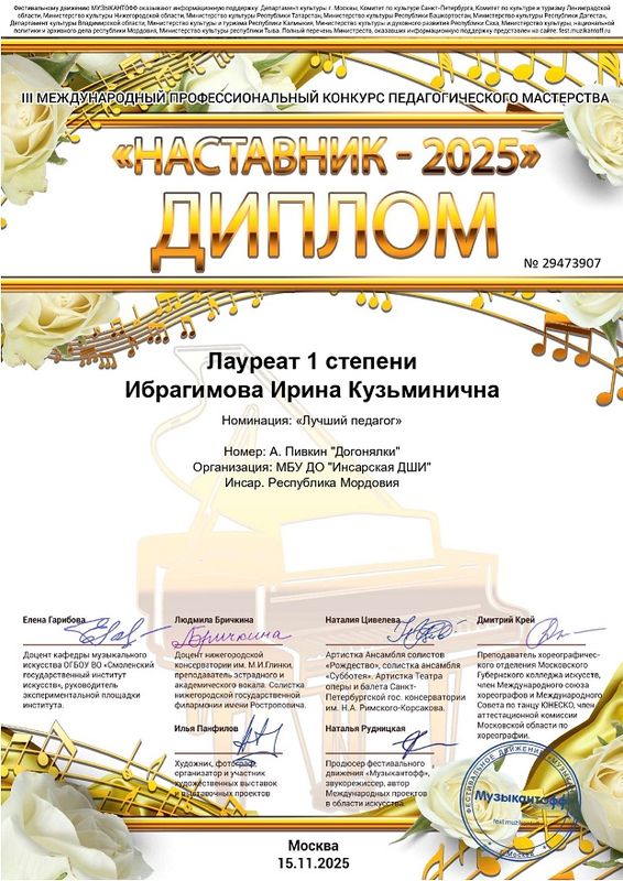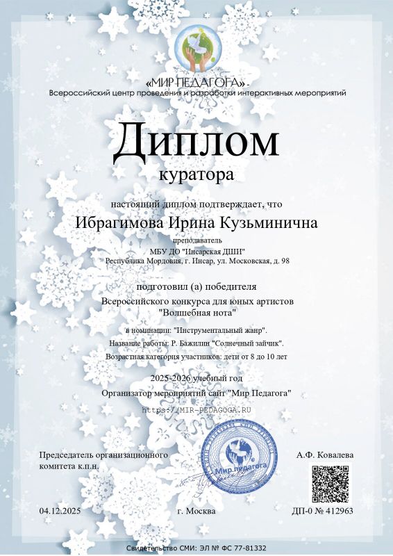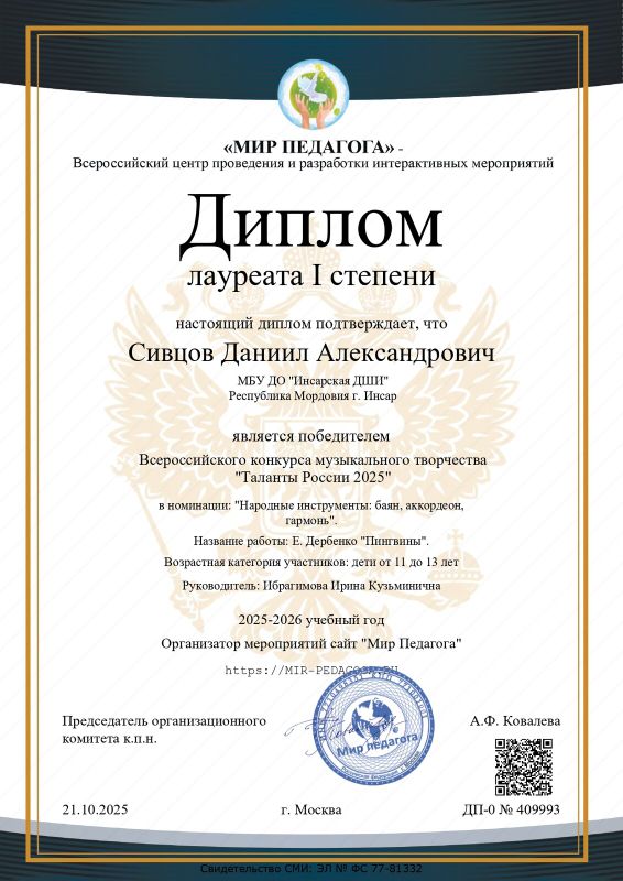 | Сведения о повышении квалификации (за последние 3 года) | Удостоверение о повышении квалификации 0003636; рег.номер 3602 от 31.01.2024 г. по дополнительной профессиональной программе "Современные образовательные технологии и методики обучения игре на народных инструментах (баян, аккордеон, домра, балалайка, гитара)" в объёме 72 часа. |
