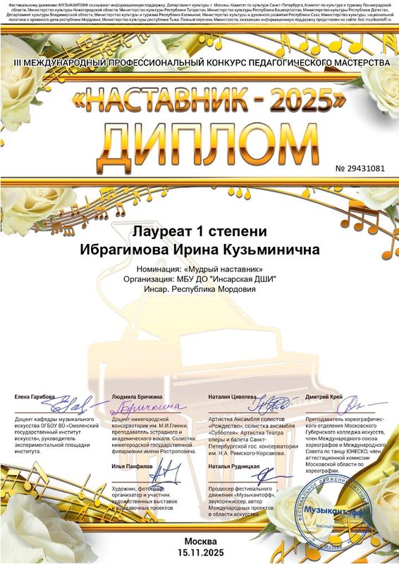 | Уровень профессионального образования, квалификация | Среднее специальное образование. Саранское Государственное музыкальное училище им. Л.П. Кирюкова. Специальность - отделение народных инструментов по классу аккордеон, квалификация: преподаватель ДМШ по классу аккордеон и дирижёр самодеятельного оркестра народных инструментов.1982 г. |