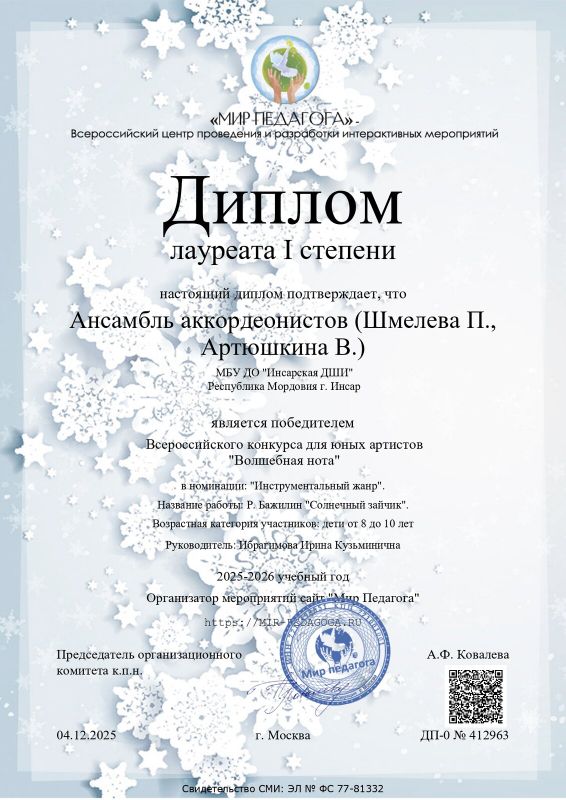 | Наименование образовательных программ, в реализации которых участвует педагогический работник | Дополнительная предпрофессиональная образовательная программа в области музыкального искусства "Народные инструменты" специальность "Аккордеон" |