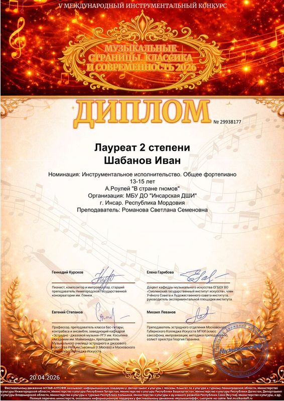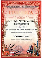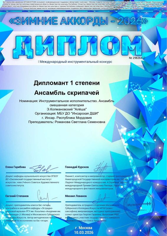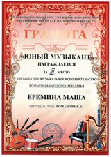 | Сведения о повышении квалификации (за последние 3 года) | Удостоверение о повышении квалификации 0001789; рег.номер КПК - 3845 от 22.06.2022 г. по дополнительной профессиональной программе "Специфика оркестрового и сольного исполнительства на струнных инструментах: технология и методика (скрипка, альт, виолончель)"; в объёме 36 часов. |