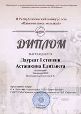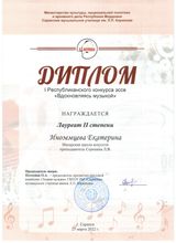 | Уровень профессионального образования, квалификация | Среднее специальное образование. Саранское государственное музыкальное училище им. Л.П. Кирюкова.Специальность - фортепиано, присвоена квалификация: преподаватель, концертмейстер |